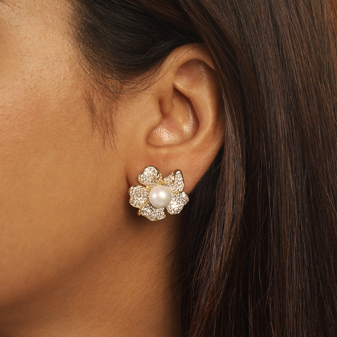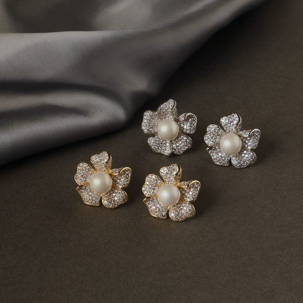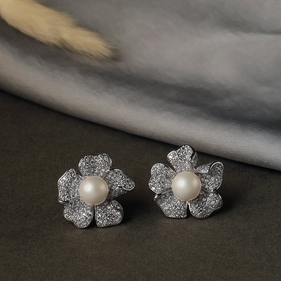 Dimensions: Length-1.5cm Weight-Only 3gm per Earring Gracefully feminine and effortlessly refined, the Leila Pearl Earrings – Silver are a timeless ode to elegance. Shaped like delicate blooming flowers, each petal is encrusted with dazzling diamonds that frame a lustrous central pearl offering a harmonious blend of softness and sparkle. Perfect for intimate soirées, festive celebrations, or charming day outings, these earrings lend a whisper of vintage romance to any ensemble. Pair them with flowy pastels or structured classics for a look that speaks volumes without saying a word.