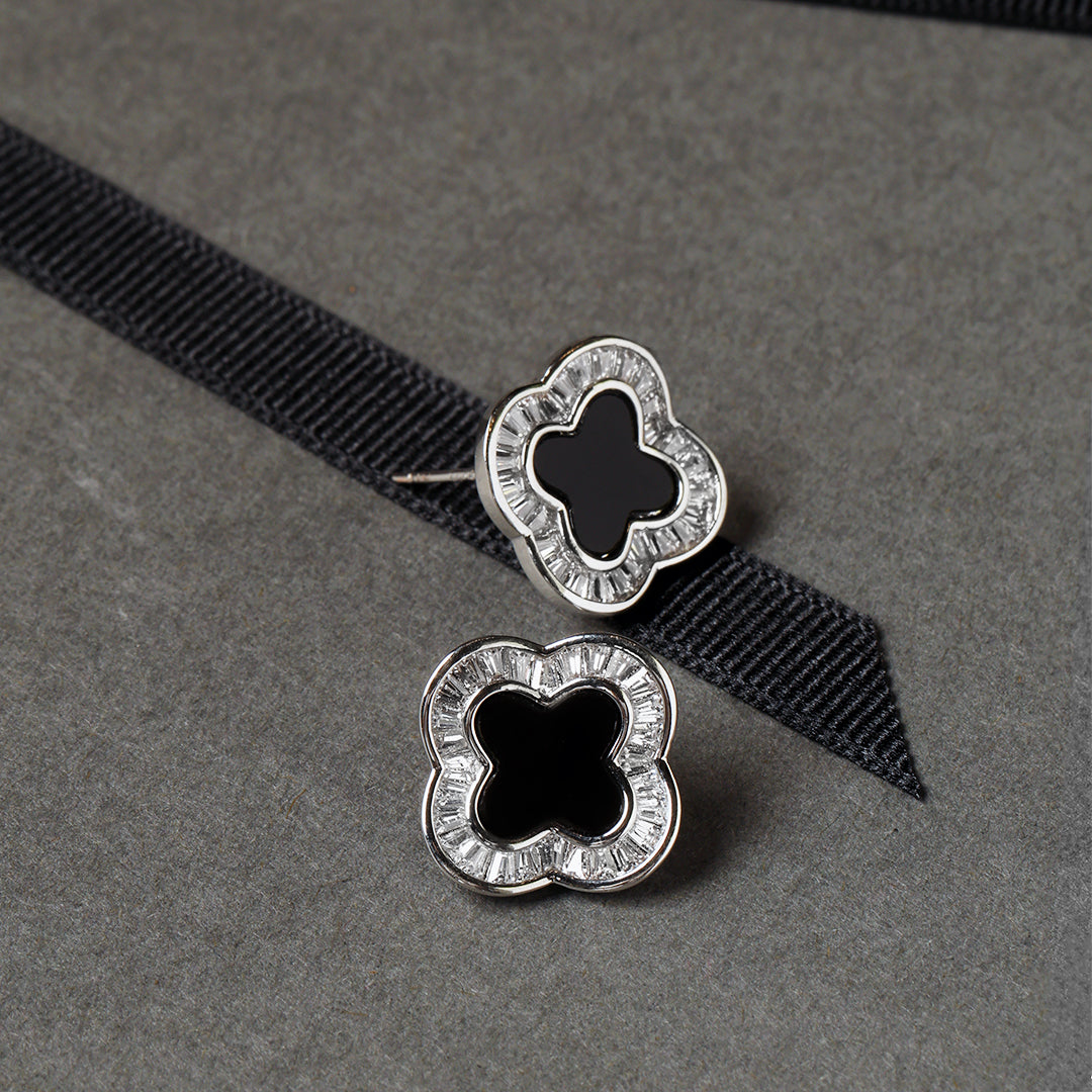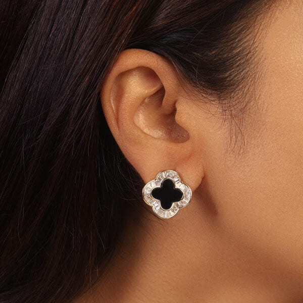 Dimensions: Length-2cm Weight-Only 3gm per Earring A symbol of timeless elegance, the Black MOP Clover Earrings blend classic charm with modern sophistication. Crafted in a lustrous silver finish, each earring showcases a stunning black Mother of Pearl inlay, exuding depth and luxury. The iconic clover design represents luck and grace, making these earrings perfect for both formal and casual ensembles. Whether styled with structured blazers or flowing dresses, they offer a refined yet versatile statement for any occasion.