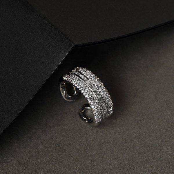 Dimensions: 8+Free Size The Esther Ring-Silver by House of Shabz exudes confidence with its sculptural design and luminous diamond detailing. The sleek, double-band structure creates an interplay of brilliance and texture, making it the perfect accessory for a polished, power-dressing moment. Pair it with structured silver hoop earrings and a tailored blazer for an effortlessly chic office-to-evening transition. For an extra edge, complement it with a diamond-studded cuff bracelet.