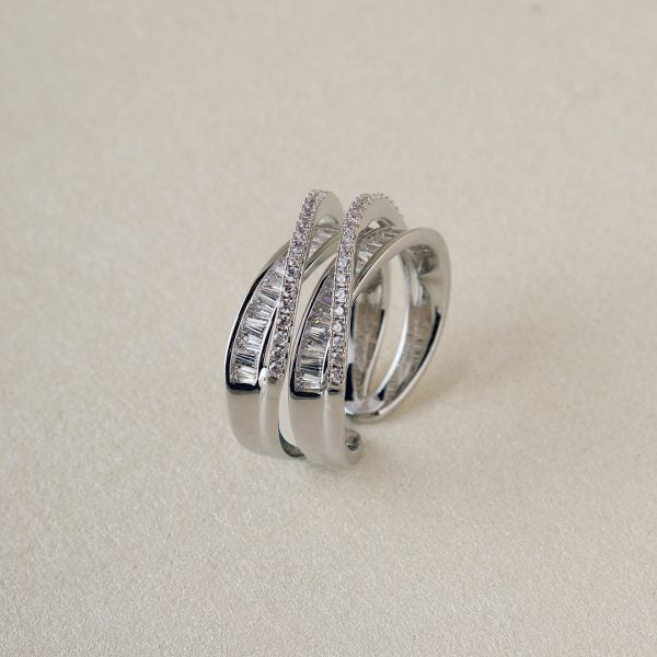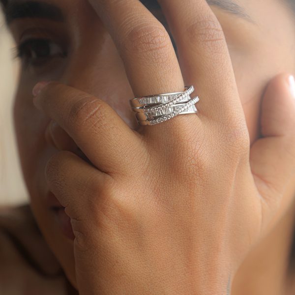 Dimensions: 8+Adjustable (Easy to press or expand as per your Requirements) Sleek, sophisticated, and effortlessly chic the Niloofar Diamond Ring by House of Shabz is a true modern masterpiece. Crafted in radiant Gold, its fluid, interwoven design creates the illusion of stacked, interconnected bands, each adorned with a dazzling mix of baguette-cut and pav? diamonds. Striking yet versatile, this ring seamlessly transitions from day to night, making it the ultimate statement for those who embrace contemporary elegance with an edge.