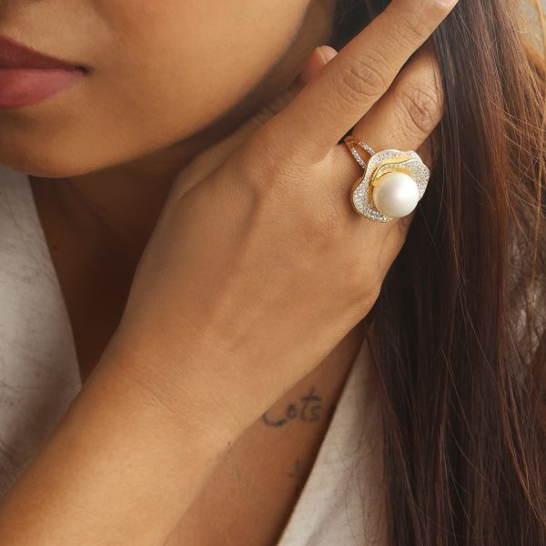 Dimensions: 8+Free Size Bold, opulent, and effortlessly chic the Bahar Pearl Diamond Ring-Gold by House of Shabz is where vintage romance meets modern glamour. A statement pearl blooms at the center, framed by sculptural gold petals infused with high-shine brilliance. The adjustable design ensures a flawless fit, making it your go-to for striking, fashion-forward styling. Pair it with sleek gold ear cuffs and a monochrome power suit for a look that?s equal parts fierce and feminine.