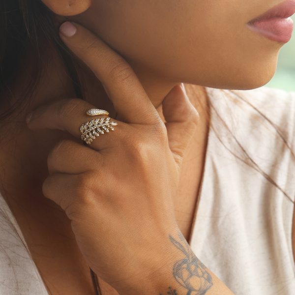 Dimensions: 7+Free Size The Pines Diamond Ring ? Gold is a bold fusion of nature and high fashion. Featuring a sculptural vine design with intricately set baguette cut stones in luxe gold, this statement piece exudes effortless elegance. The open-ended silhouette adds a modern, runway ready edge perfect for styling with a sleek satin slip dress or pairing with delicate gold bracelets for a refined, fashion-forward look. Wear it from power meetings to cocktail nights, adding instant glamour to every moment.