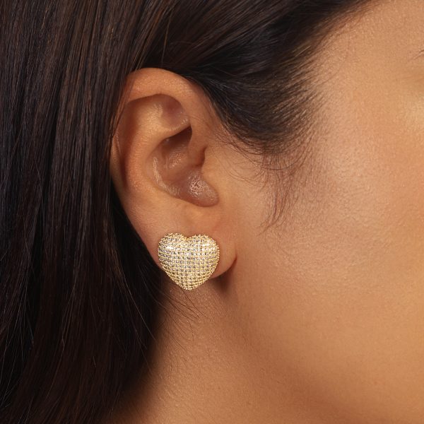Dimensions: Length-1.5cm Weight-Only 2gm per Earring Express your affection with the charming Heart Alexa Earrings in Gold. These delightful heart-shaped studs are pavé-set with shimmering crystals, creating a radiant sparkle in a warm gold tone. Perfect for adding a sweet and elegant touch to everyday outfits like casual tops and jeans, they also bring a romantic flair to evening ensembles such as dresses or blouses. These earrings are ideal for daily wear, special dates, or as a thoughtful gift to express love. Let these adorable earrings redefine your style with their heartfelt sparkle and delicate charm.