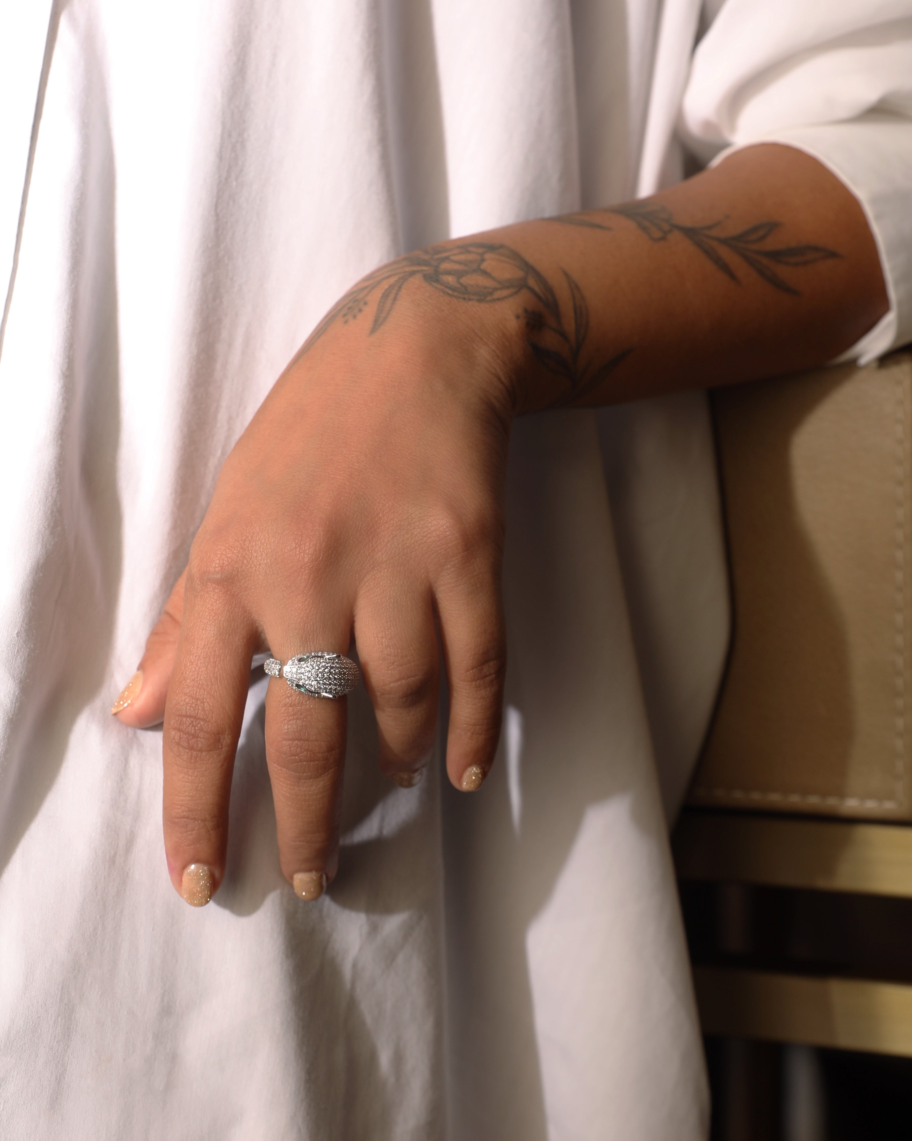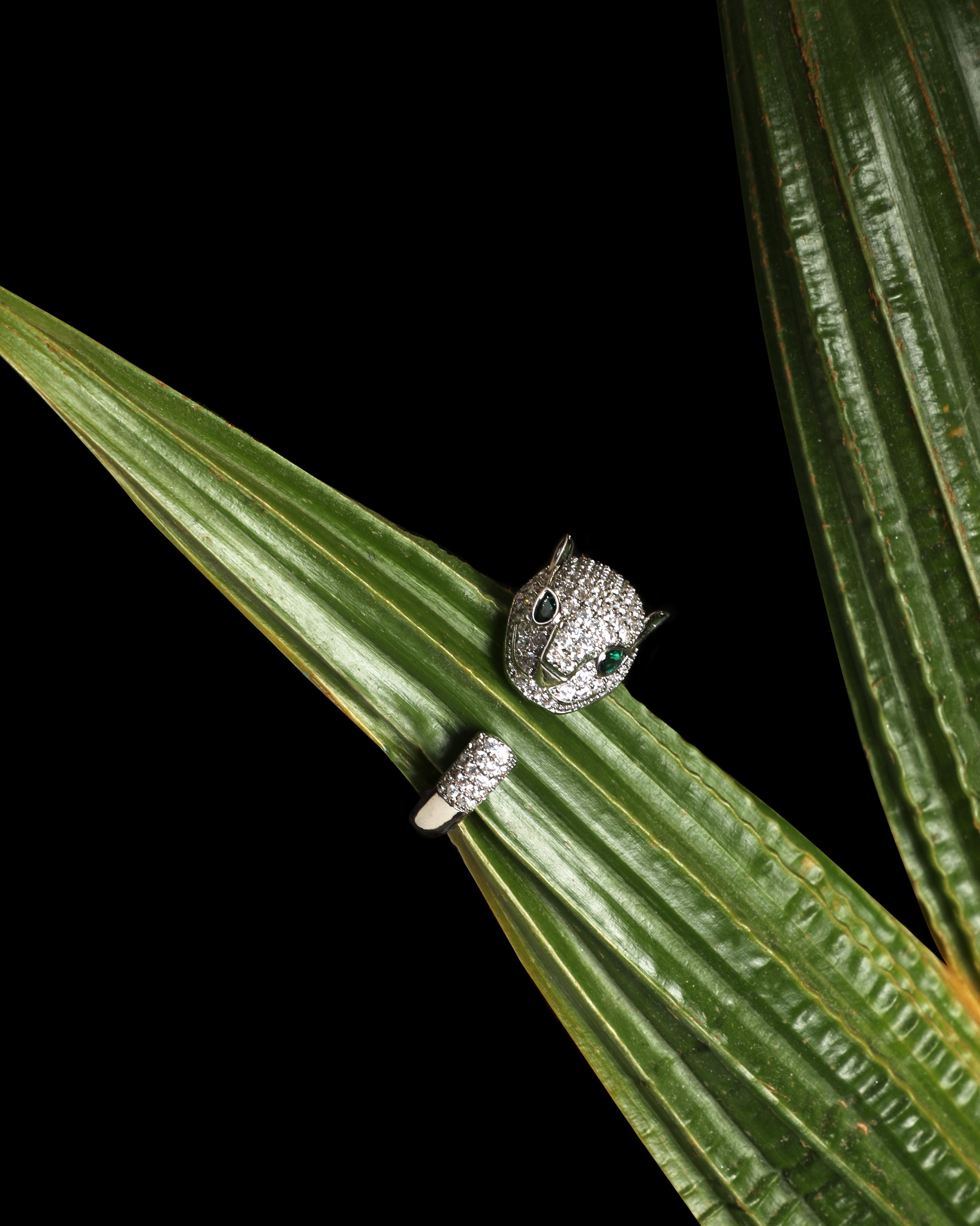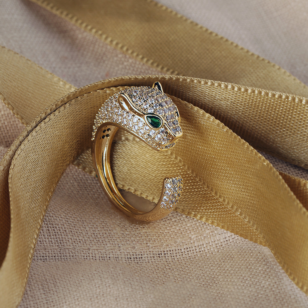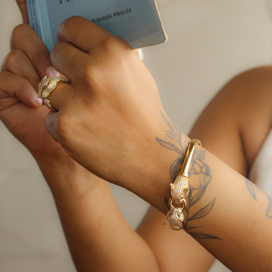 Dimensions: 7+Adjustable (Easy to press or expand as per your Requirements) Fierce, fearless, and undeniably stylish, the Panther Gold Ring from House of Shabz embodies untamed elegance. With its sleek gold-tone finish, sparkling pave setting, and piercing green eyes, this adjustable ring is designed to turn heads. The open design ensures a comfortable, custom fit, making it perfect for all-day wear. Style it solo for a striking impact or stack it with delicate bands for a modern, layered look that blends power with sophistication.