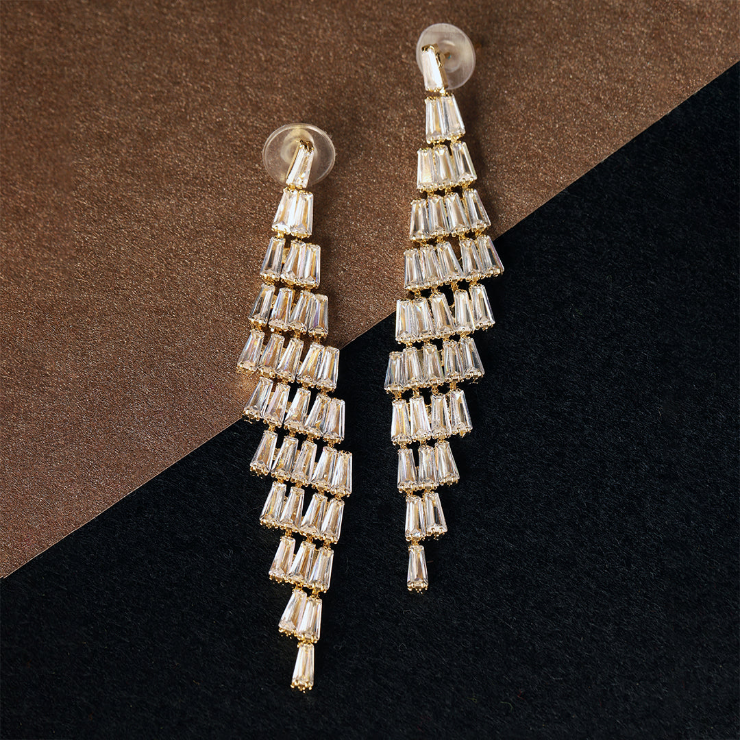 Dimensions: Length-8cm Weight-Only 5gm per Earring Elevate your evening allure with the Marianna Earrings in Gold. These glamorous, cascading earrings feature multiple tiers of sparkling, baguette-cut crystals, creating a dazzling waterfall effect. Perfect for making a dramatic statement with elegant gowns, sophisticated cocktail dresses, or any formal attire. These earrings are ideal for special occasions, red-carpet events, or whenever you desire to exude undeniable radiance and sophisticated drama. Let this breathtaking pair redefine your style with their captivating sparkle and graceful movement.