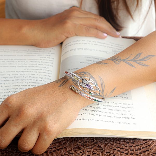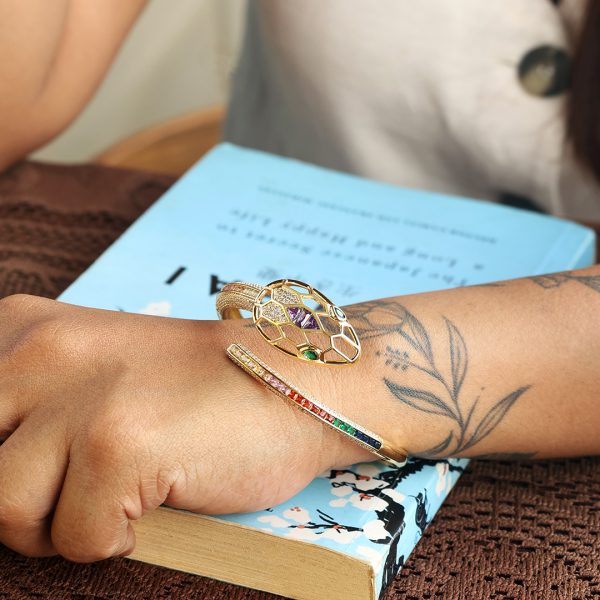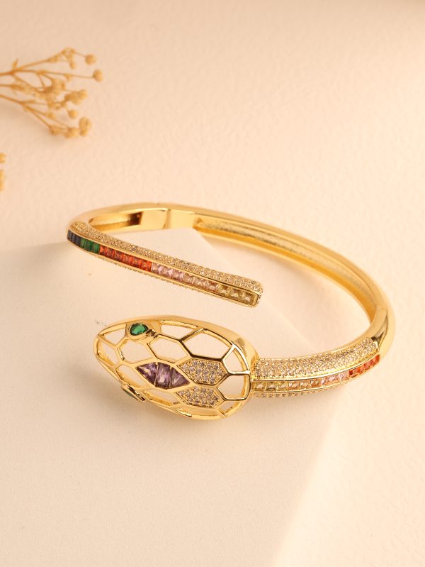 Dimensions: 2.6 (Indian) Openable The Nagin Multi Gold Kada is a striking fusion of bold design and artistic finesse. Its serpent-inspired form, adorned with multicolored stones, adds an avant-garde touch to any look. Perfect for high-fashion events, festive soir?es, or cocktail nights, this statement piece pairs effortlessly with sleek gowns or edgy contemporary wear. Whether worn solo or stacked, it?s a daring yet sophisticated addition to your jewelry collection.