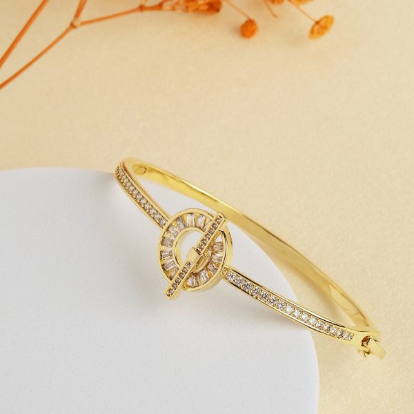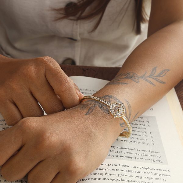 Dimensions: 2.4 (Indian) Easly Openable with Lock The Shirin Gold Kada is the epitome of understated chic, blending modern elegance with timeless allure. Its sleek interlocking design, adorned with dazzling stones, adds a refined yet fashion-forward touch. Perfect for soir?es, brunches, or formal events, it pairs beautifully with minimalist outfits or layered wristwear for a statement finish. Whether styled with an evening gown or a power suit, this kada exudes sophistication with a contemporary edge.