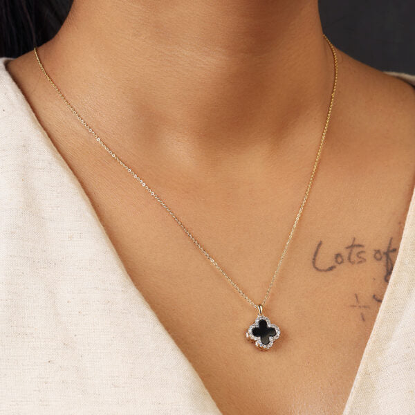 Dimensions: Length-Chain with Pendant at midpoint 22 cm plus 6 cm Extender Metal – Stainless Steel with 18KT gold plating, which means that under proper care, the polish can last for years Further Details-Anti tarnish Embrace timeless elegance with the Black and White Clover Dual Side Pendant – Gold, a versatile masterpiece designed to complement every occasion. Featuring a reversible clover motif one side in bold black and the other in pristine white framed with dazzling stones, this pendant lets you switch up your style effortlessly. Whether paired with a sleek evening gown, a tailored blazer, or a casual chic outfit, its sophisticated charm adds the perfect finishing touch. A symbol of luck and luxury, this dual-sided beauty is your new go-to statement piece.