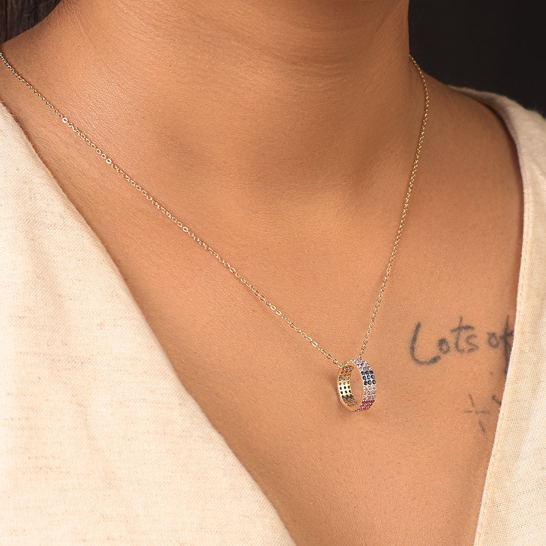 Dimensions: Length- Chain with Pendant at midpoint 21 cm plus 6 cm Extender Metal – Stainless Steel with 18KT gold plating, which means that under proper care, the polish can last for years Further Details-Anti tarnish The VIBGYOR Pendant is a vibrant celebration of color and elegance. Designed with a captivating arc of multicolored stones, this pendant embodies joy, positivity, and individuality. Set against a radiant gold finish, the spectrum of hues creates a striking visual appeal, making it a standout addition to any jewellery collection. A true statement piece, this pendant adds a lively charm to any look. Whether styled with neutral tones for contrast or paired with bold colors for a striking effect, the VIBGYOR Pendant brings a playful yet sophisticated touch to your ensemble.