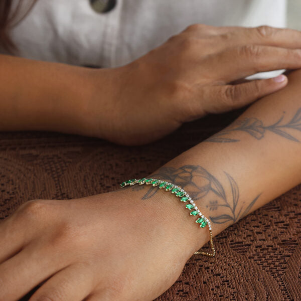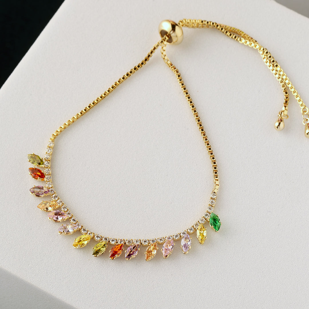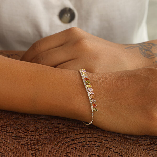 The Multi Erisha Bracelet is a delicate yet striking piece, designed to add a touch of romance and elegance to any outfit. Its shimmering multicolour stones set against a gold-tone adjustable chain make it a versatile choice for both casual and formal occasions. Whether you’re heading to a brunch, a date night, or a wedding celebration, this bracelet enhances your style with effortless grace. Lightweight and adjustable, it ensures a comfortable fit for every wrist.