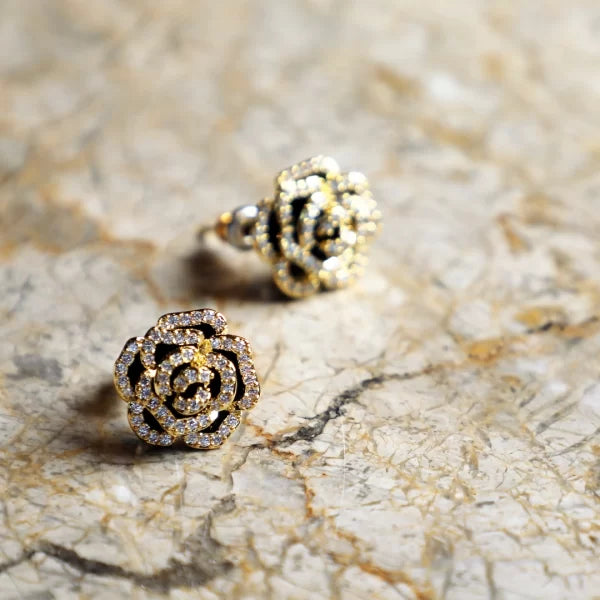 Dimensions: Length-1cm Weight-Only 3gm per Earring Elevate your jewellery collection with the exquisite Black Gold Rose Earrings Small a delicate fusion of elegance and artistry. Designed with intricate rose motifs and encrusted with shimmering stones, these earrings exude timeless sophistication. The contrast of black and gold adds depth and luxury, making them a perfect statement piece for both special occasions and everyday wear. Pair them with evening gowns for a graceful touch or style them with structured blazers and chic casuals for an effortlessly refined look. Let these earrings bloom in your collection, radiating charm with every wear.