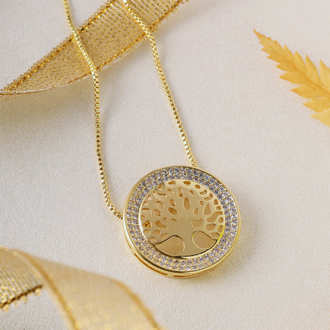 Dimensions: Length-Chain with Pendant at midpoint 22 cm plus 6 cm Extender Metal – Stainless Steel with 18KT gold plating, which means that under proper care, the polish can last for years Further Details-Anti tarnish Embrace timeless beauty with the Tree of Life Pendant, a radiant emblem of strength, growth, and harmony. Expertly crafted in a lustrous gold finish, this exquisite piece features an intricate cutwork design framed by a halo of shimmering stones. A versatile addition to your jewellery collection, it complements both contemporary and classic ensembles with effortless grace. Style it with flowing silhouettes, structured blazers, or minimalist outfits to exude refined sophistication.