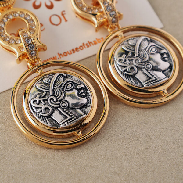 Dimensions: Length-8cm Weight-Only 25gm per Earring Bold and opulent, the Viktoria Earrings channel ancient grandeur with a modern edge. Featuring antique coin motifs framed in radiant gold, accented by abalone textures and shimmering crystals, this statement pair exudes warrior goddess energy. Perfect for pairing with draped saris, structured gowns, or power suits, they’re an ode to strength, history, and unapologetic style. Step into your spotlight these earrings were made to be seen.