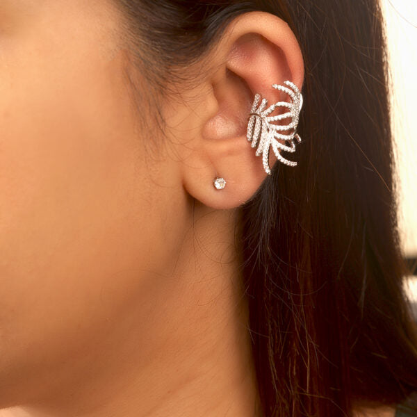 Dimensions: Length-2.5cm Weight-Only 3gm per Earring Inspired by the elegance of nature, the Feather Cuff – Silver is a delicate yet bold statement of freedom and grace. Crafted with intricate feather detailing, this cuff wraps effortlessly around the ear, offering a seamless blend of sophistication and edge. Its radiant silver finish enhances its ethereal charm, making it the perfect accent for both casual and elevated looks. Let this captivating piece add a touch of effortless glamour to your jewellery collection