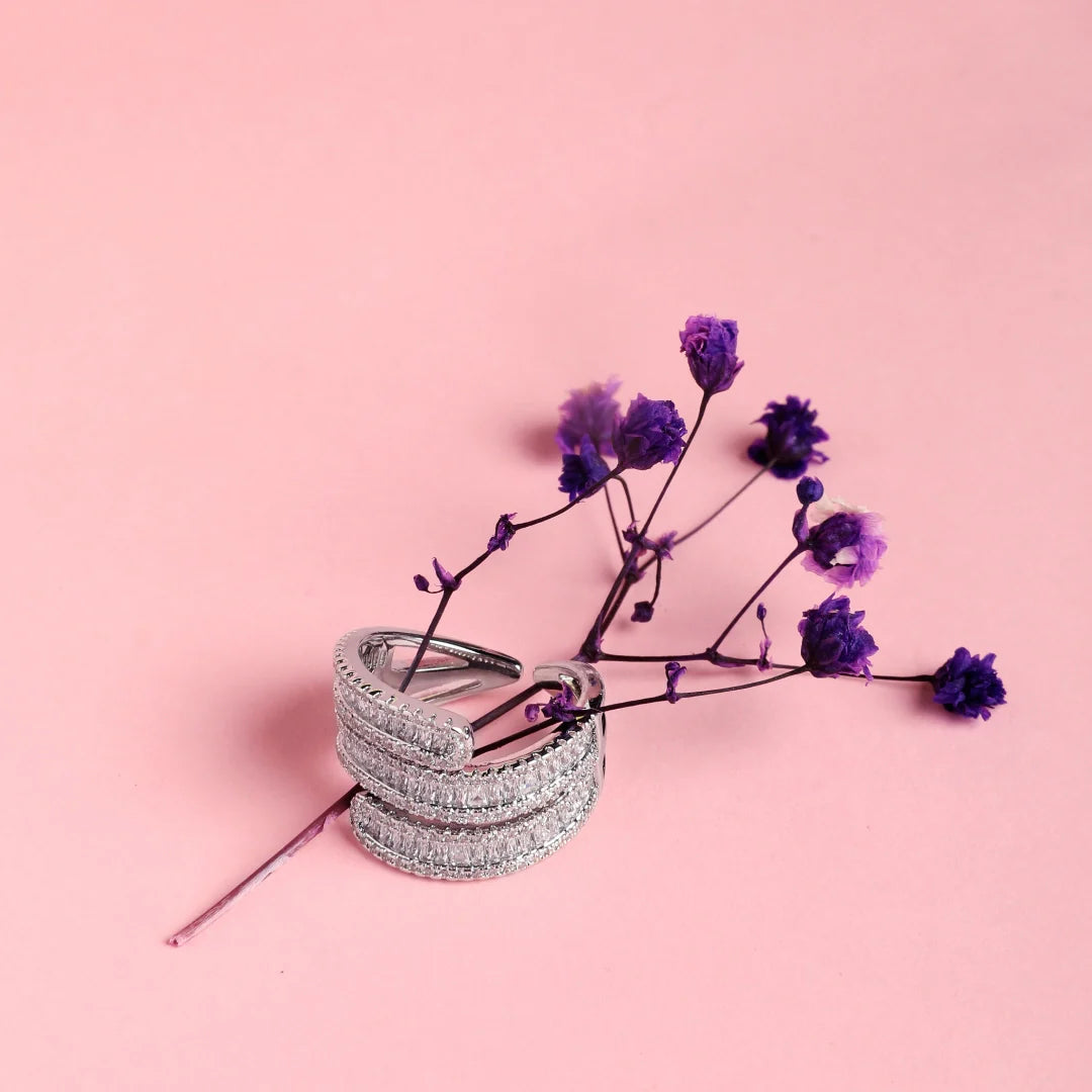 Dimensions: 8.5+Free Size The Nagheen Silver ring by House of Shabz is where timeless elegance meets modern sophistication. Its fluid silhouette, adorned with rows of baguette-cut and brilliant-cut stones, creates a mesmerizing play of light with every movement. The layered design gives it a stacked feel, adding depth and dimension that exudes classic opulence. With its regal appeal, this piece makes a statement of refined luxury. Pair it with a tailored white blazer and sleek diamond studs for an effortlessly chic, power-dressing moment, or wear it with an evening gown for a look that?s nothing short of royal.