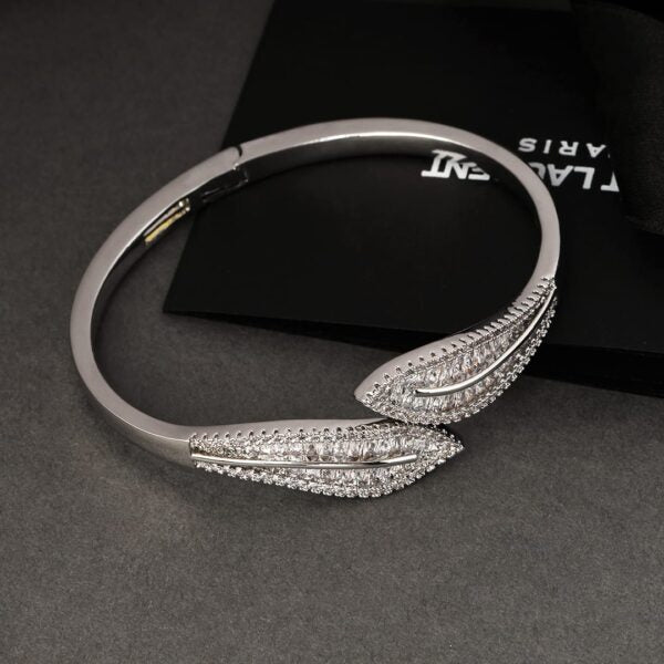 Dimensions: 2.2 (Indian) Easly Openable The Alingan Diamond Kada is a mesmerizing blend of modern sophistication and timeless elegance. Designed with intricate craftsmanship, its fluid, leaf-like silhouette is adorned with dazzling stones that catch the light with every movement. Ideal for festive gatherings and evening soir?es, this statement piece pairs beautifully with traditional attire and contemporary ensembles alike. Wear it solo for refined glamour or stack it for a bold, fashion-forward look.