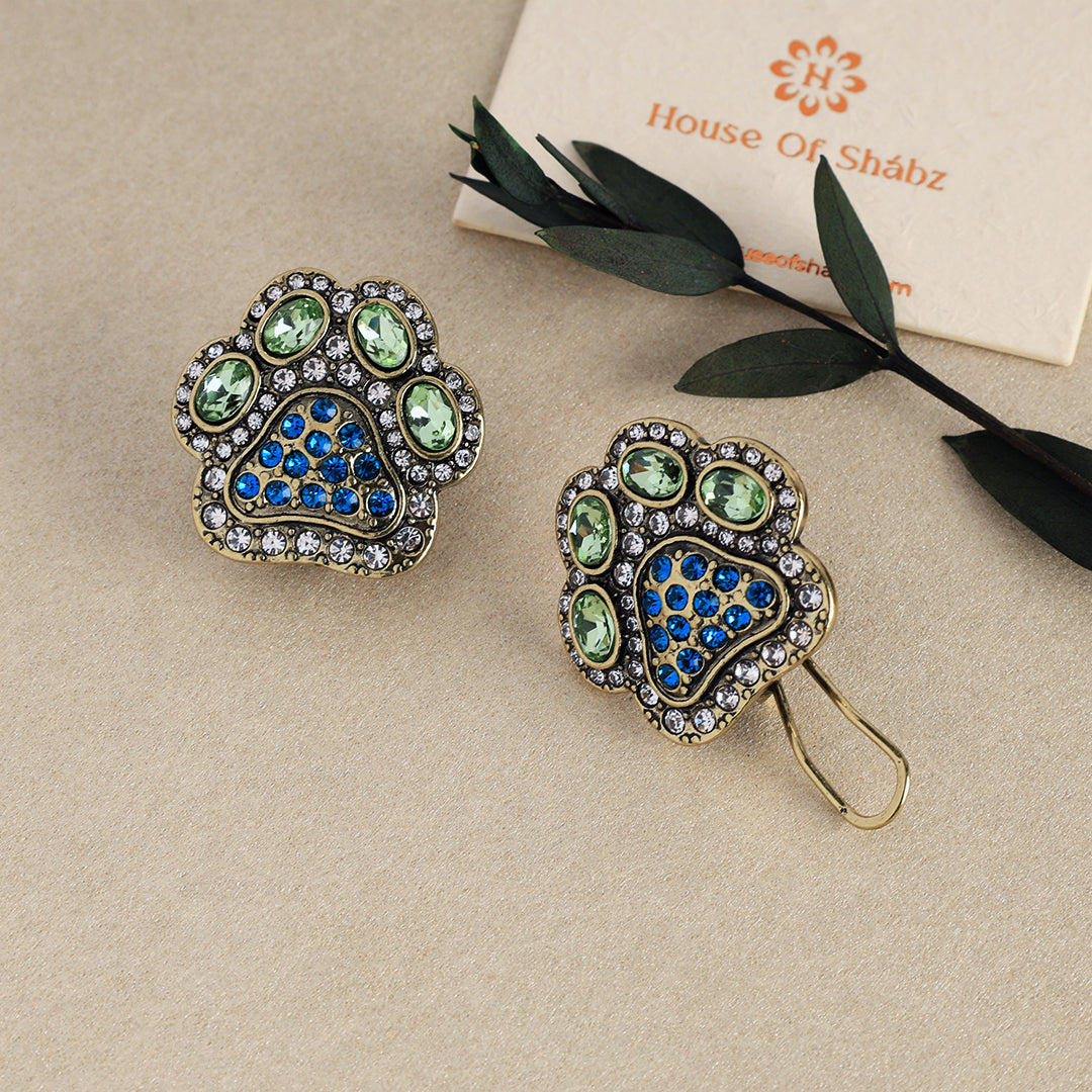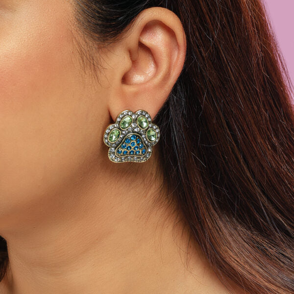 Dimensions: Length-3cm Weight-Only 9gm per Earring Show your love for furry friends with the adorable Cute Paw Earrings. These charming studs feature a detailed paw print design, embellished with sparkling blue and green crystals set in a warm gold tone. Perfect for adding a playful and whimsical touch to everyday outfits like casual tops and jeans, they also make a sweet statement with dresses or skirts. These earrings are ideal for animal lovers, casual outings, or as a thoughtful gift. Let this delightful pair redefine your style with their charming and unique design.
