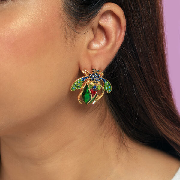 Dimensions: Length-3cm Weight-Only 7gm per Earring A playful yet elegant addition to your jewelry collection, the Multicolor Honey Bee Earrings capture nature's beauty with a vibrant twist. Designed with intricate detailing, these earrings feature a radiant gold finish adorned with multicolored stones, bringing a lively and luxurious touch. Perfect for brunches, casual outings, or evening affairs, they pair effortlessly with both bold and understated ensembles. Let these charming bees add a hint of whimsy and sophistication to your style.