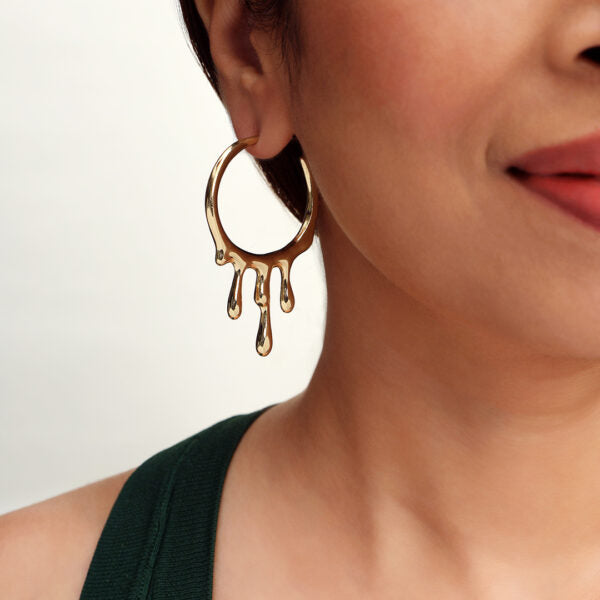 Dimensions: length-5cm Weight-Only 10gm per Earring Sculptural, edgy, and irresistibly chic the Simona Hoop Earrings redefine classic hoops with a molten gold-inspired design. The fluid, dripping effect creates a striking silhouette, making these earrings a bold expression of modern artistry. Crafted for those who dare to stand out, these hoops are perfect for adding an avant-garde touch to any outfit. Whether paired with sleek evening wear or elevating a casual look, they exude confidence and sophistication.