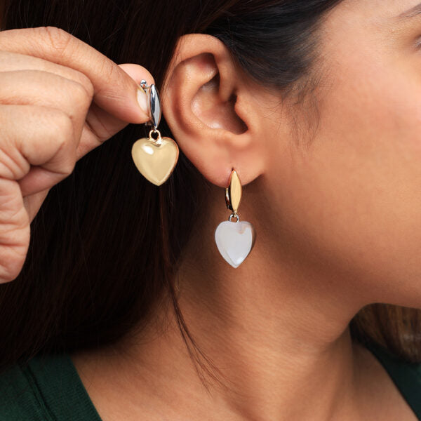 Dimensions: length-3.5cm Weight-Only 3gm per Earring Gracefully designed to capture the essence of romance, these two-tone heart drop earrings blend modern sophistication with timeless charm. Featuring a harmonious contrast of lustrous silver and warm gold, each heart dangles delicately from a sleek, polished hoop creating a fluid movement that catches the light beautifully. Perfect for everyday elegance or a heartfelt gift, these earrings are a true celebration of love, style, and versatility.