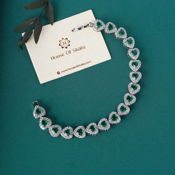 Dimensions: Length- 19.5cm lock to last hook A delicate balance of romance and sophistication, the Heart Bracelet is adorned with dazzling green gemstones, creating a vibrant yet elegant statement. Each heart-shaped stone is meticulously set to catch the light from every angle, adding a radiant touch to your wrist. Whether worn alone for subtle charm or stacked for bold glamour, this bracelet effortlessly elevates any outfit, making it the perfect blend of playful vibrance and timeless sophistication.