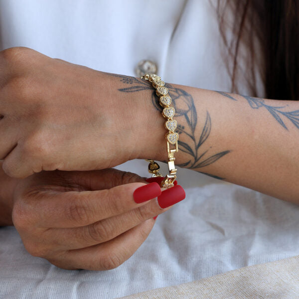 Dimensions: Length- 19.5cm lock to last hook The Tennis Heart Diamond Bracelet is a timeless piece exuding elegance and charm. Featuring heart-shaped diamond embellishments set in a lustrous gold base, it offers a radiant sparkle from every angle. The intricate craftsmanship and seamless design make it perfect for both everyday wear and special occasions. With a secure clasp ensuring comfort, this bracelet adds a refined touch to any ensemble, making it an ideal choice for those who appreciate sophisticated, statement jewelry.