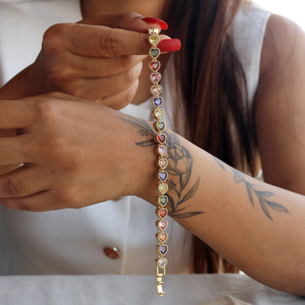 Dimensions: Length- 18.5cm lock to last hook A delicate balance of romance and sophistication, the Heart Bracelet is adorned with dazzling multicolour gemstones, creating a vibrant yet elegant statement. Each heart-shaped stone is meticulously set to catch the light from every angle, adding a radiant touch to your wrist. Whether worn alone for subtle charm or stacked for bold glamour, this bracelet effortlessly elevates any outfit, making it the perfect blend of playful vibrance and timeless sophistication.