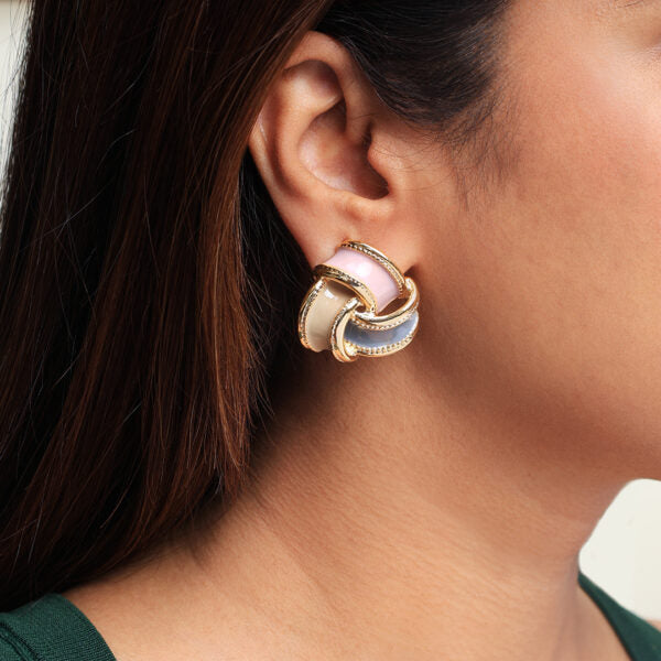 Dimensions: length-3cm Weight-Only 9gm per Earring Introducing the Alaina Earrings, a seamless blend of vintage charm and contemporary flair. These sophisticated gold-plated earrings feature interwoven pastel enamel accents in soft pink, nude, and charcoal hues, evoking a sense of refined artistry. The intricate gold beaded detailing adds a touch of opulence, making them the perfect statement accessory for any occasion whether you’re elevating a casual outfit or adding a polished touch to evening wear.