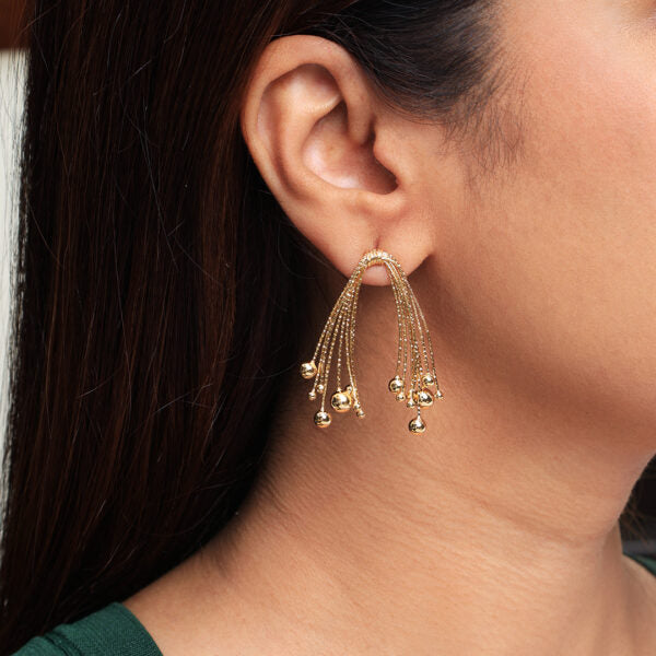 Dimensions: length-4cm Weight-Only 3gm per Earring Unveil a touch of modern artistry with the Eliana Earrings, a mesmerizing cascade of delicate gold strands adorned with gleaming spheres. Designed to capture movement and fluidity, these statement earrings bring effortless grace to any look. Their dynamic silhouette adds a playful yet sophisticated charm, making them the perfect accessory for both refined evening wear and contemporary daytime ensembles. Elevate your jewellery collection with these striking, lightweight earrings that redefine elegance with a touch of whimsy.