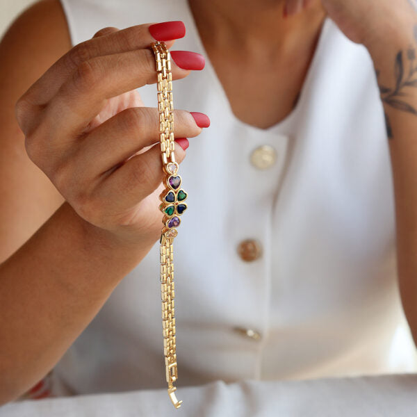 Dimensions: Length- 20cm lock to last hook A perfect blend of charm and sophistication, the Feona Flower Bracelet is a symbol of elegance and love. Featuring a unique floral design with heart-shaped gemstones, this bracelet is ideal for special occasions such as anniversaries or as a meaningful gift for someone dear. Its luxurious gold-tone and intricate detailing make it a standout piece for both casual and formal looks.