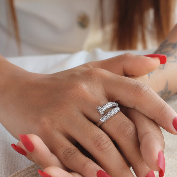 Dimensions: 7.5+Free Size Juliana Diamond Silver Adjustable Ring ? Radiating sophistication, this silver-tone beauty is a vision of grace and brilliance. Intricately encrusted with sparkling diamonds, its sleek, curved design exudes understated glamour. The open-ended structure offers a customizable fit, making it both stylish and versatile. Whether worn solo for a chic statement or layered with other pieces, this ring seamlessly complements any occasion, bringing effortless elegance to your everyday look.