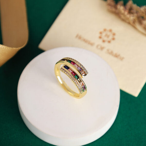 Dimensions: 8+Free Size Rainbow Gold Adjustable Ring ? A fusion of elegance and playfulness, this gold-finished beauty is adorned with a spectrum of radiant gemstones, making it a statement piece for any occasion. Its sleek, open-ended design offers adjustability with an effortless edge, ensuring a perfect fit every time. Whether paired with everyday essentials or bold evening looks, this ring is the ultimate balance of sophistication and vibrant charm