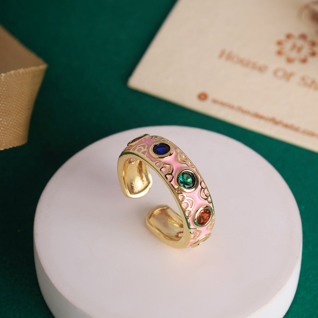 Dimensions: 7+Free Size The Aqua Rainbow Stone Ring is a fusion of timeless artistry and modern elegance. Designed with an aqua enamel base, this ring is adorned with a vibrant array of multicolored gemstones, creating a mesmerizing contrast of hues. Delicate gold detailing adds a regal touch, making it a statement piece for those who appreciate refined, handcrafted jewelry. Whether worn solo or stacked, this ring is perfect for elevating your everyday look with a pop of color and sophistication.