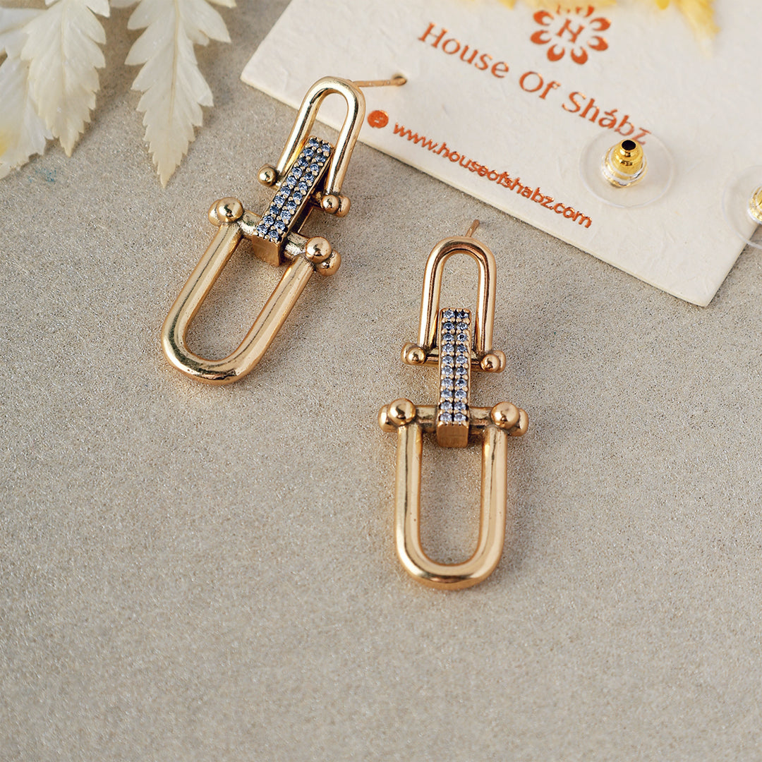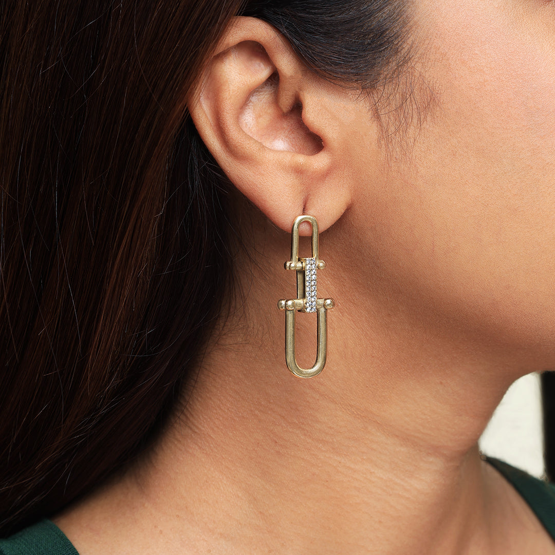 Dimensions: length-4cm Weight-Only 5gm per Earring Redefine elegance with the Zenna Diamond Earrings, a fusion of contemporary design and refined luxury. These statement earrings feature a sleek, elongated link silhouette accented with shimmering diamonds, creating a bold yet sophisticated look. The intricate detailing and radiant gold finish add an edge to any ensemble, making them a perfect choice for both power dressing and evening glamour. Whether paired with structured suits or flowing gowns, let these earrings elevate your style with their modern charm and timeless allure.