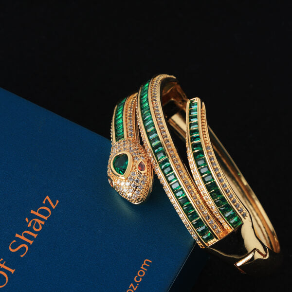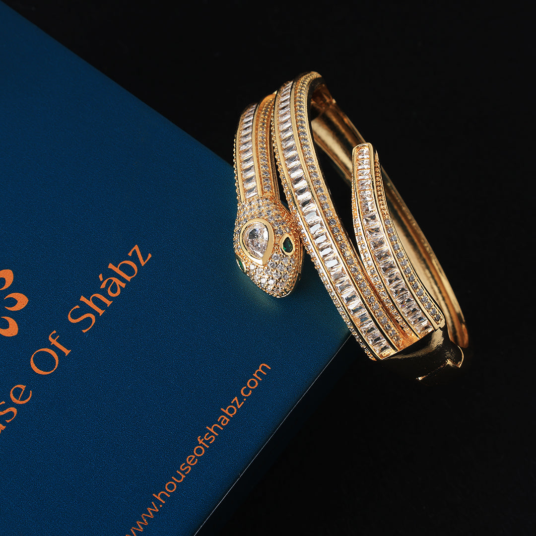 Dimensions: 2.6 (Indian) Easly Openable with Lock The Serpent Kada in green is a bold yet elegant statement piece for any occasion. Crafted with precision, its sleek, coiling design symbolizes strength and grace, while dazzling green stones add a captivating shimmer. This striking piece brings glamour to evening gowns, sophistication to chic daywear, and power to formal attire. Perfect for festive celebrations, pair it with sarees or lehengas for a regal touch. Whether styled solo or layered, this kada effortlessly enhances your look with refined allure and timeless charm.