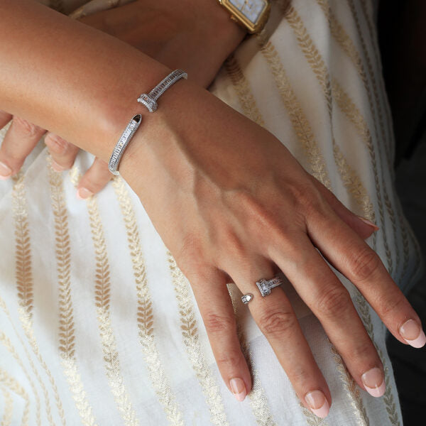 Dimensions: 2.6 (Indian) Openable The Maisy Diamond Kada in gold is a timeless accessory that seamlessly transitions from day to night. Its sleek design and sparkling baguette-cut diamonds make it perfect for elegant soir?es, festive celebrations, and even sophisticated workwear. Pair it with a traditional saree or lehenga for a regal touch, or style it with an evening gown for understated glamour. For a contemporary look, wear it with a tailored blazer or a chic monochrome outfit. Whether worn solo for a minimal statement or stacked with other bracelets for a layered effect, this kada elevates any ensemble effortlessly.