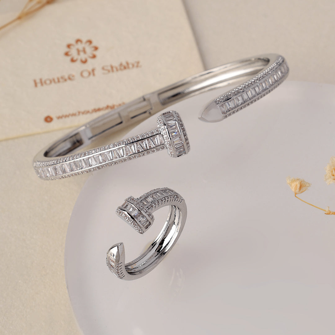 Dimensions: 9+Free Size The Maisy Diamond Gold Ring is a symphony of modern design and timeless brilliance. Its geometric pattern, crafted with step-cut and micro-studded stones, creates a sleek, structured look that catches the light with every movement. The alternating textures add depth and dimension, making this piece a statement of effortless sophistication. Adjustable for a perfect fit, this ring blends contemporary charm with classic allure ideal for both everyday elegance and high-fashion styling. Perfect for a glamorous evening, a celebratory event, or adding a luxe touch to your daily ensemble.