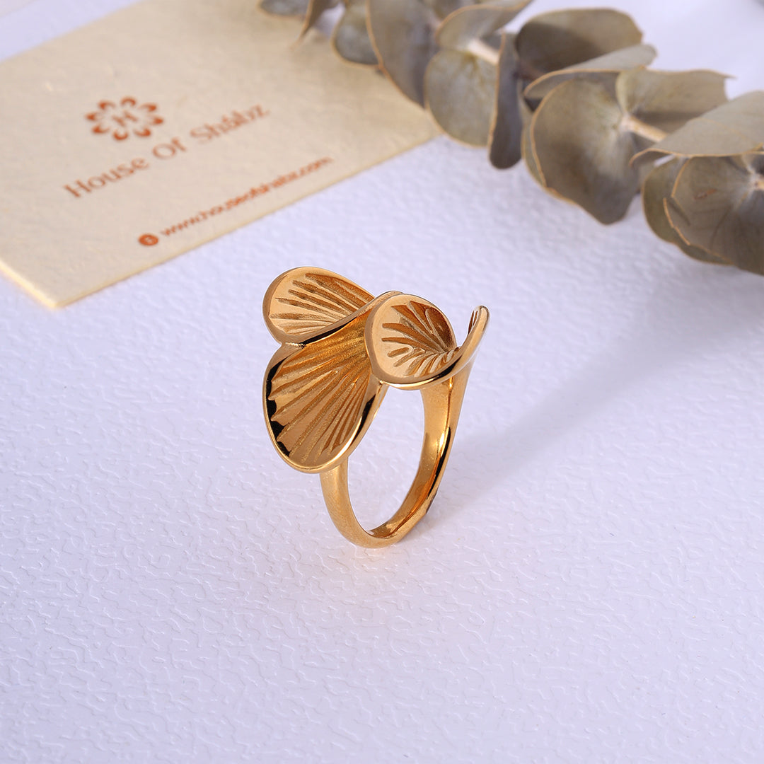 Dimensions: 9+Free Size Inspired by nature?s effortless beauty, the Tri Leaf Ring is a chic and versatile statement piece that blends organic elegance with contemporary design. The intricate leaf motif, sculpted with precision, adds a touch of fluid artistry to your look. Wear it solo for a refined minimalist appeal, or pair it with delicate gold bands for a layered, fashion-forward effect. Whether styled with casual ensembles or evening wear, this free-size ring is the perfect balance of sophistication and trend a must have for the modern muse.