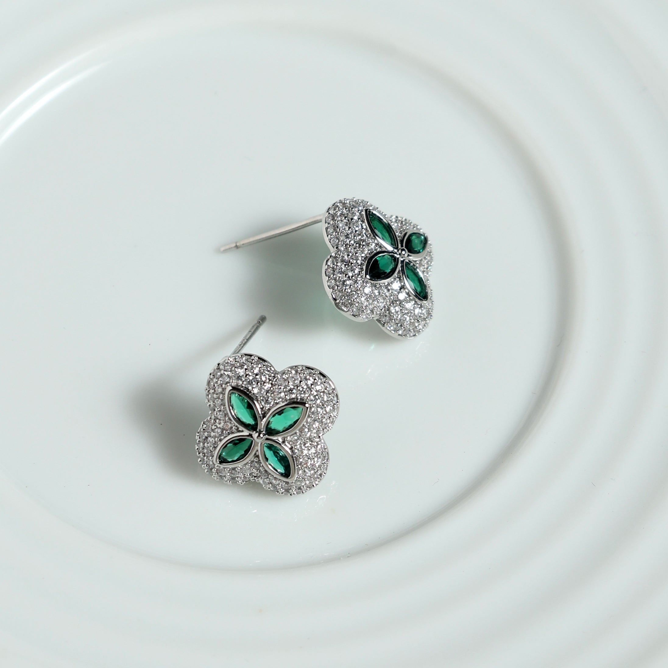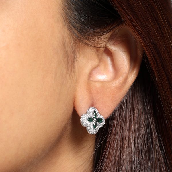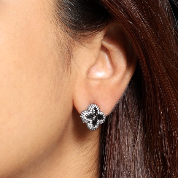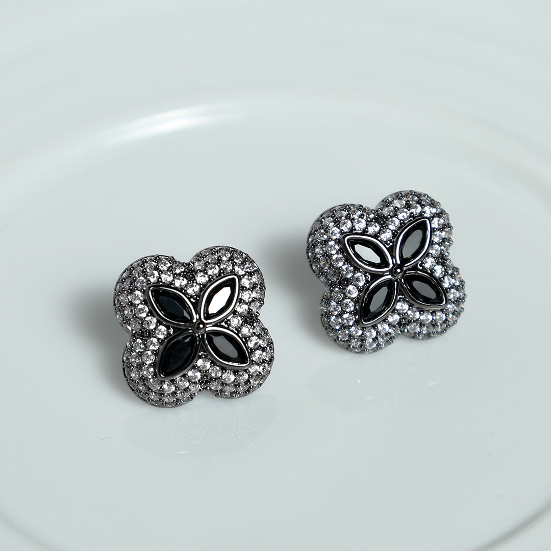 Dimensions: Length-1cm Weight-Only 1gm per Earring These chic clover-shaped studs offer a modern twist on a classic motif. Sparkling clear crystals pave the four-leaf silhouette, while sleek black, leaf-like inlays create a striking contrast. Perfect for adding a touch of understated glamour to both everyday wear and more polished ensembles, they pair effortlessly with blouses, dresses, or even a sharp blazer. These earrings are ideal for adding a subtle yet distinctive detail to work attire, social gatherings, or any occasion where you want to exude quiet confidence. Let this stylish pair redefine your look with their contemporary elegance and subtle edge.