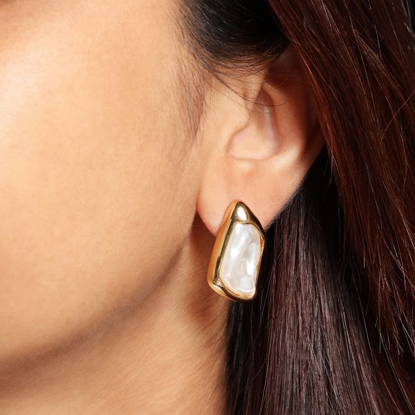 Dimensions: Length-2cm Weight-Only 4gm per Earring Elevate your everyday elegance with the Hera Earrings. These chic, abstract stud earrings feature a luminous mother-of-pearl inlay with its unique iridescence, framed by a sleek gold-toned border, offering a modern and sophisticated touch. Perfect for adding a subtle statement to both casual outfits like knitwear and jeans, they also complement smart-casual ensembles for work or daytime outings. These earrings are ideal for daily wear or for adding a touch of contemporary flair to relaxed occasions. Let these stylish earrings redefine your look with their unique design and understated glamour.