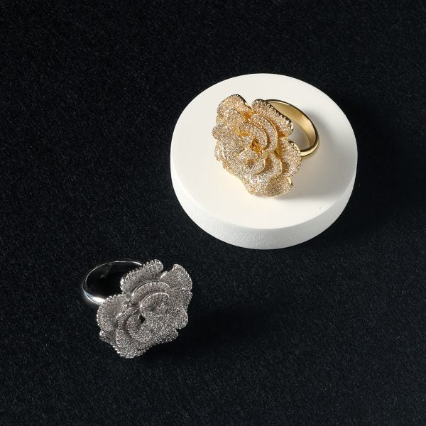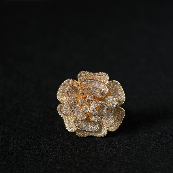 Dimensions: 7.5+Free Size Inspired by the timeless beauty of a blooming rose, the Roisin Diamond Gold Ring by House of Shabz is a breathtaking fusion of artistry and opulence. Encrusted with meticulously set diamonds, each petal shimmers with an ethereal glow, creating a dazzling interplay of light. Crafted in lustrous gold, this bold yet elegant piece is designed to command attention. Whether paired with an evening ensemble or styled as a statement accessory, it?s a celebration of femininity, grace, and high fashion.