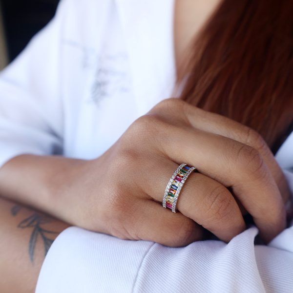 Dimensions: 8+Adjustable (Easy to press or expand as per your Requirements) The Rainbow Love Adjustable Ring is a stunning fusion of color and craftsmanship. Embedded with a seamless row of vibrant gemstones, each stone is meticulously set into the sleek gold-tone band, ensuring a smooth and refined finish. Designed for both comfort and versatility, the adjustable fit allows for effortless wear. Whether styled alone for a bold statement or stacked for a layered effect, this House of Shabz creation is the perfect balance of effortless glamour and modern allure because bold hues never go out of style