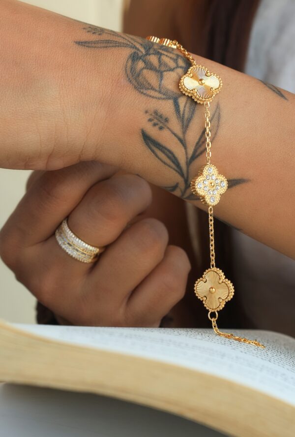 Dimensions: Length- 21cm lock to last hook A fusion of elegance and vibrant charm, the Diamond Clover Bracelet in Green adds a chic pop to your jewelry collection. The delicate clover motifs, adorned with shimmering crystals and rich green stones, bring a perfect balance of sophistication and playfulness. Set in intricate gold detailing, this bracelet is designed to stand out whether worn alone for a subtle statement or layered for a bolder look. Elevate your everyday style with this exquisite piece.